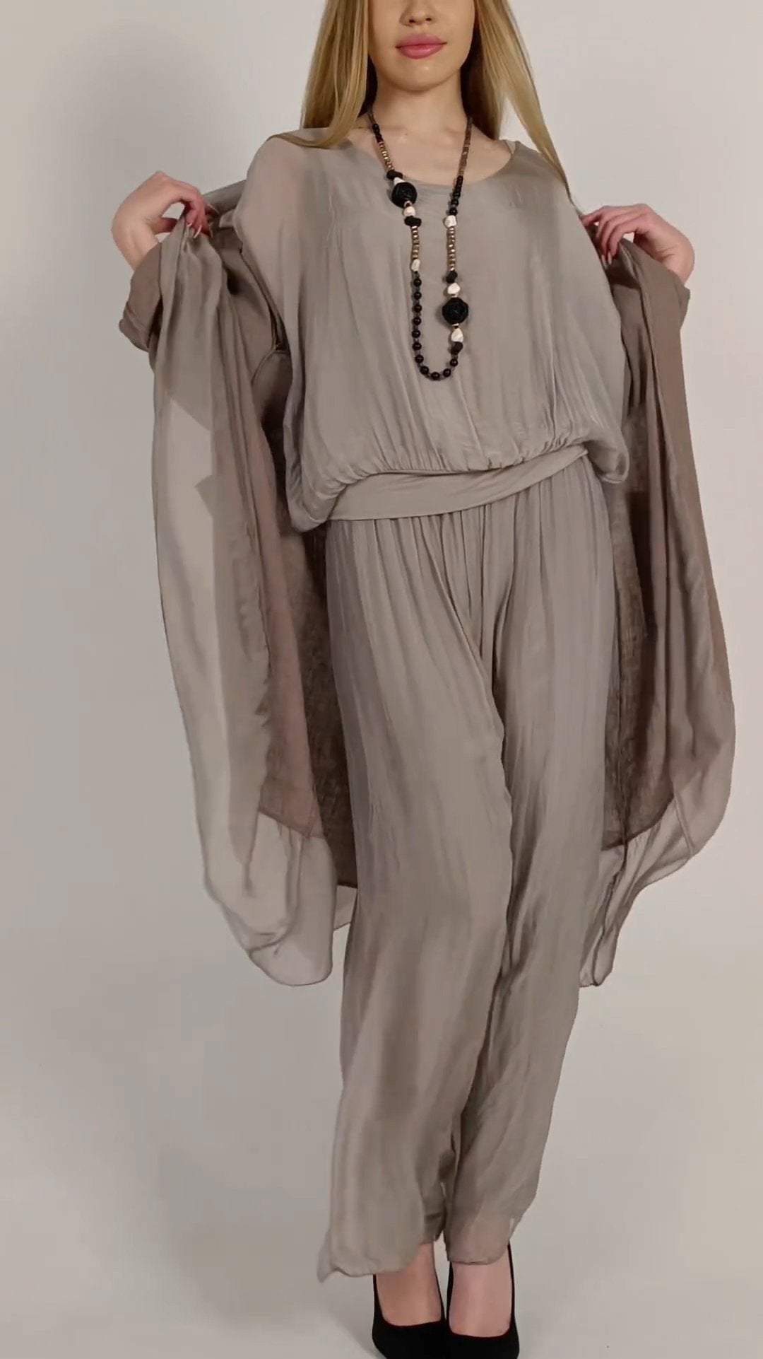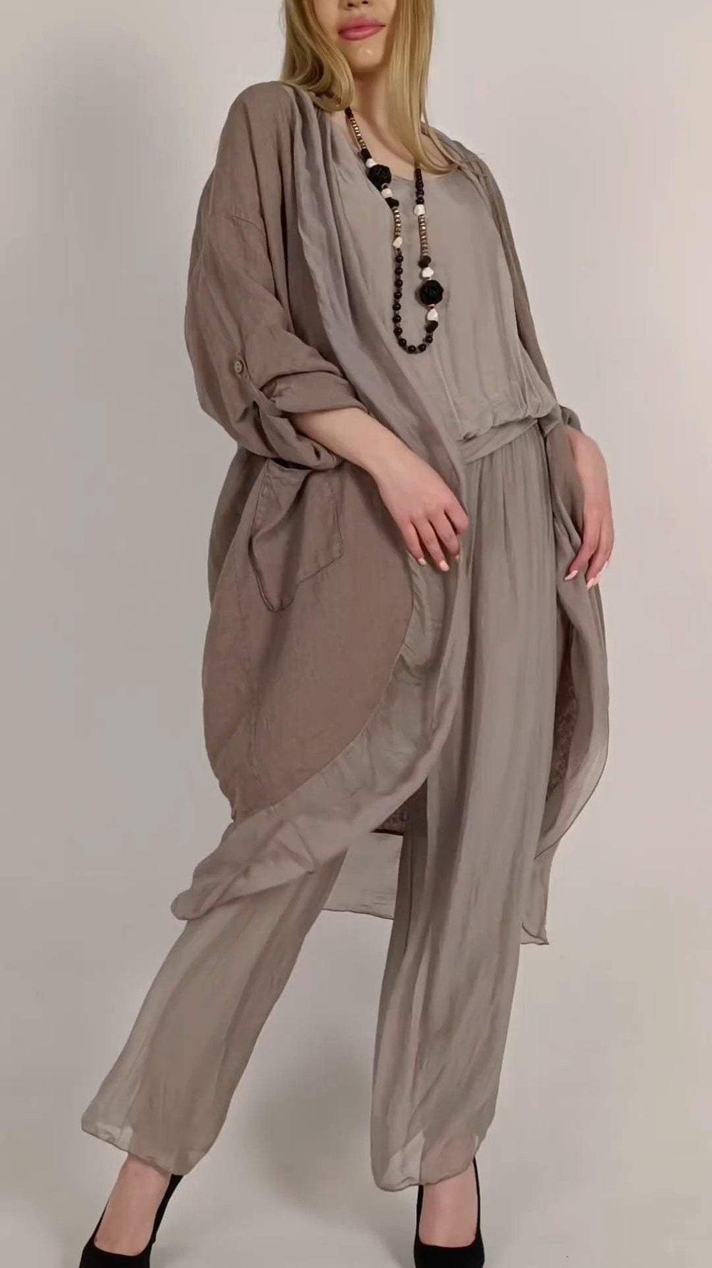 Step into timeless style and unmatched comfort with the Celeste™ Effortless Elegance Three-Piece Ensemble. This sophisticated set includes a flowing chiffon top, a relaxed-fit pair of trousers, and a matching lightweight cardigan, all crafted to provide an effortlessly chic look. Designed with the modern woman in mind, this ensemble is perfect for any casual outing or relaxed evening. The neutral tones and loose fit ensure you stay comfortable and stylish throughout the day.